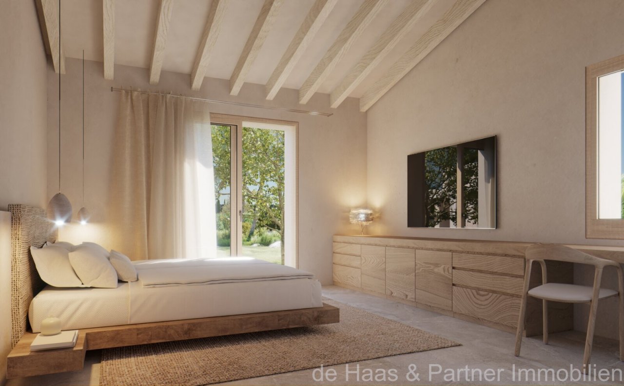 Beim Bau der Finca wurden viele mallorquinische Elemente wie Natursteinwände und sichtbare Deckenbalken eingearbeitet.