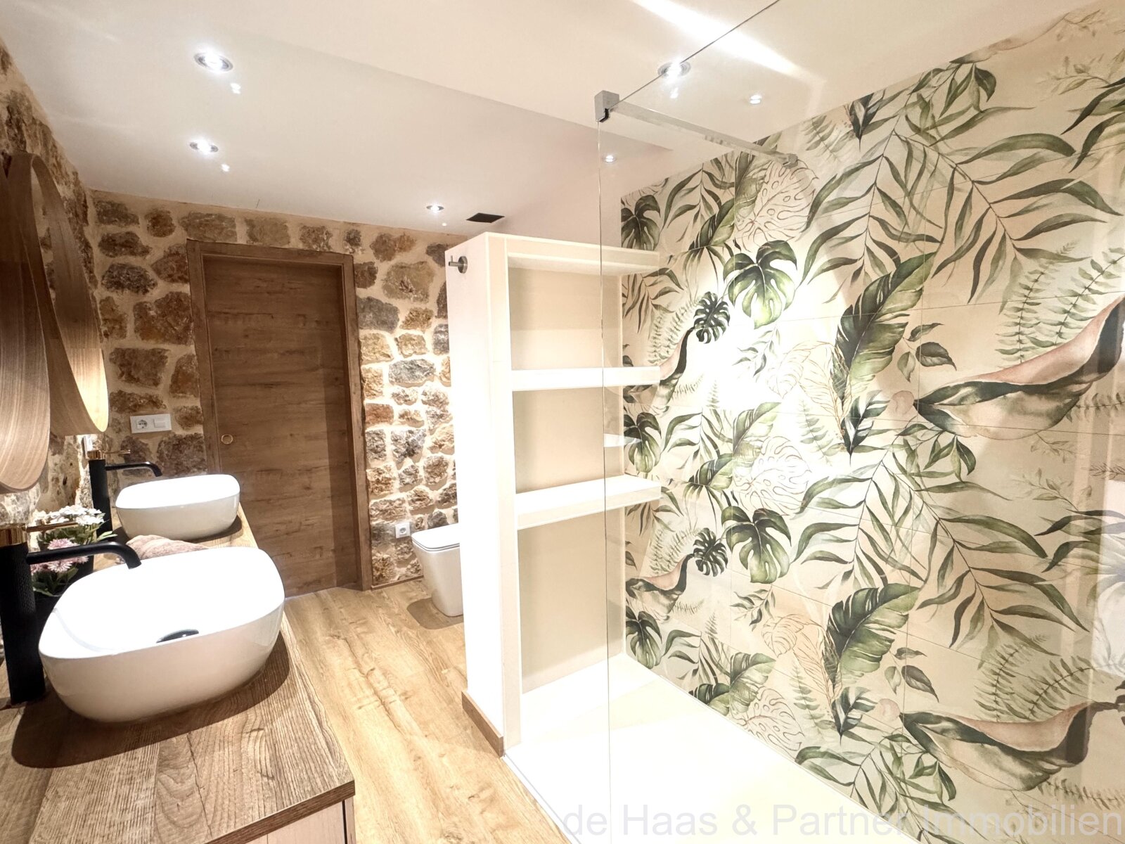 Ein liebevoll gestaltetes Badezimmer mit einer großen Dusche, welches sowohl von einem der Schlafzimmer, als auch vom Flur aus begehbar ist.