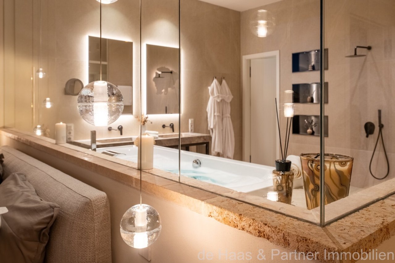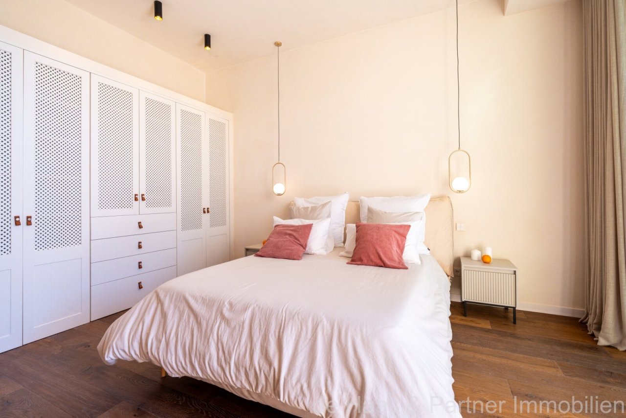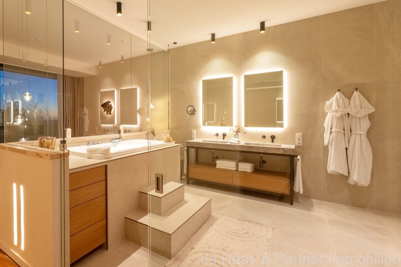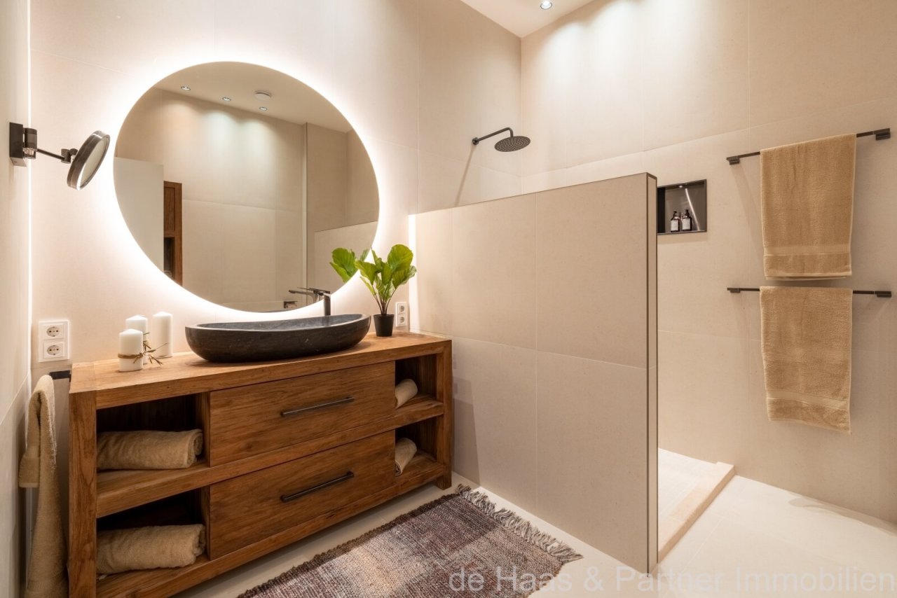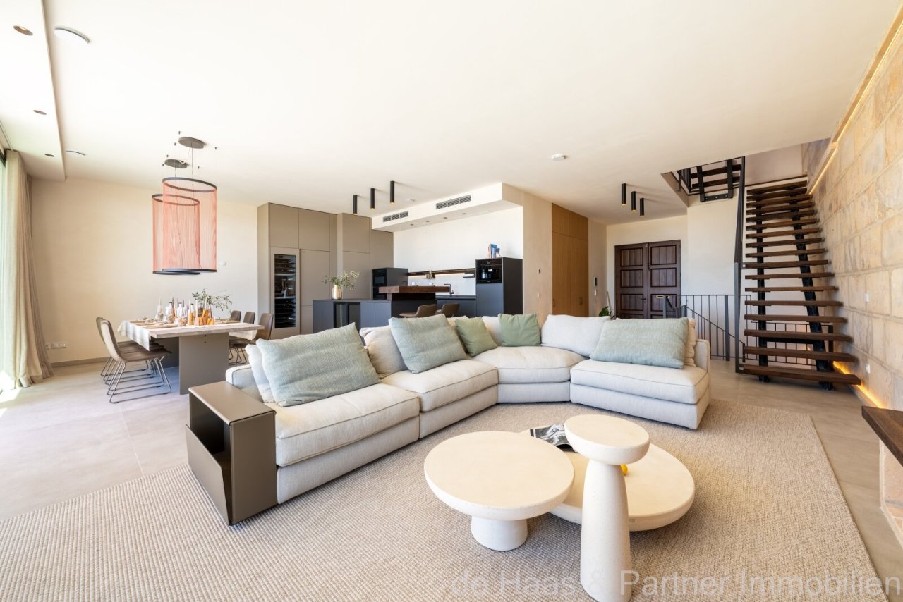 Die raumgesteuerte Fußbodenheizung, die Klimageräte, das hochwertige Smart-Home System und der eingebaute Schallschutz in sensiblen Bereichen sind nur einige Vorteile, die Sie überzeugen werden. Die Natursteinwände aus mallorquinischem Mares, die hohen Raumdecken mit 3,15 m Höhe und der 21 m² Salzwasserpool mit Wasserfall, Dusche und Beleuchtung machen ein ganz besonderes Ambiente.