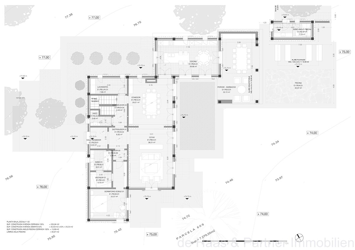 A highlight is the pool area, which offers a 30 m² pool landscape with a covered terrace, an outdoor bathroom and a technical room behind it.