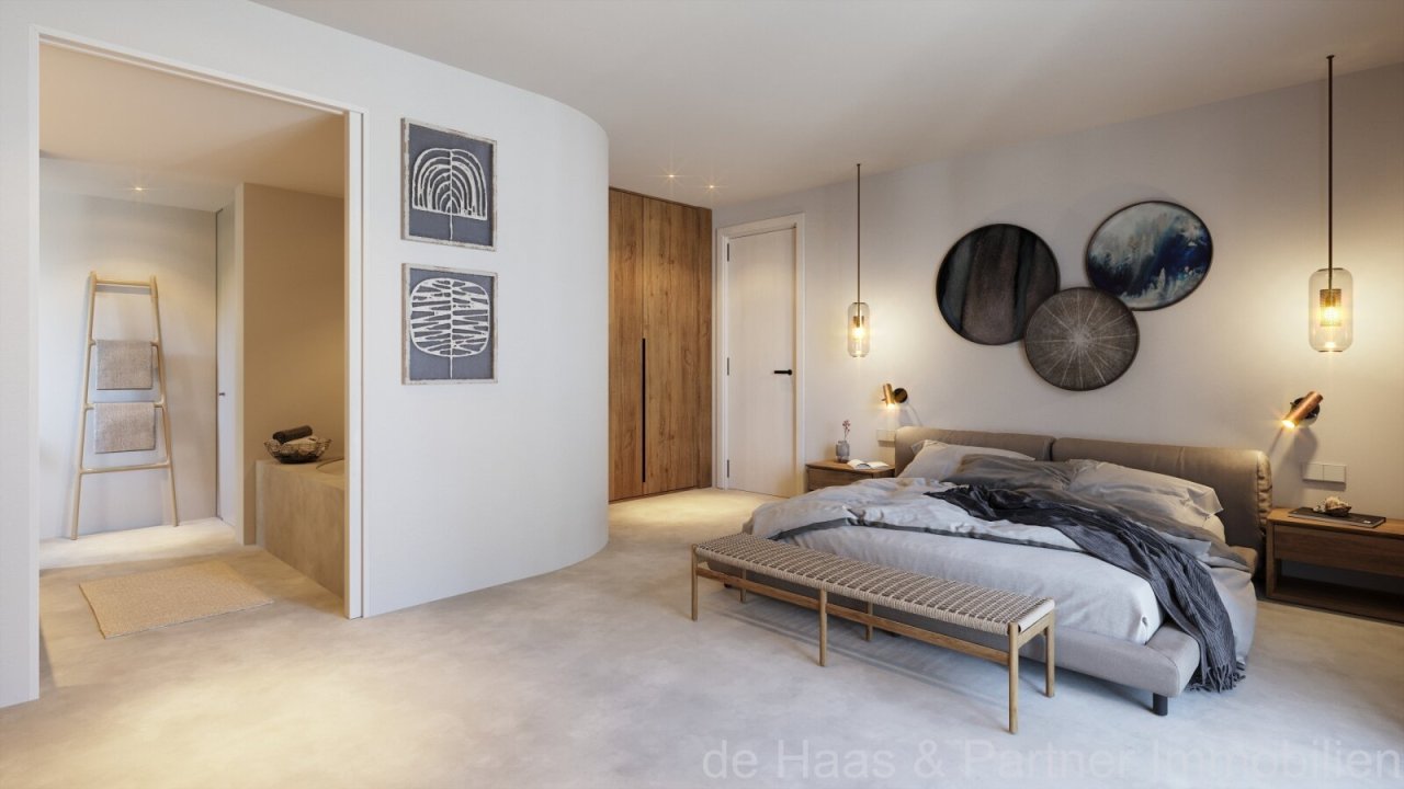 The building license includes 4 bedrooms, 3 bathrooms (two of which are en suite), a large living/dining area with an open-plan kitchen, a fitness room (which can also be designed as a guest flat) and numerous terraces.