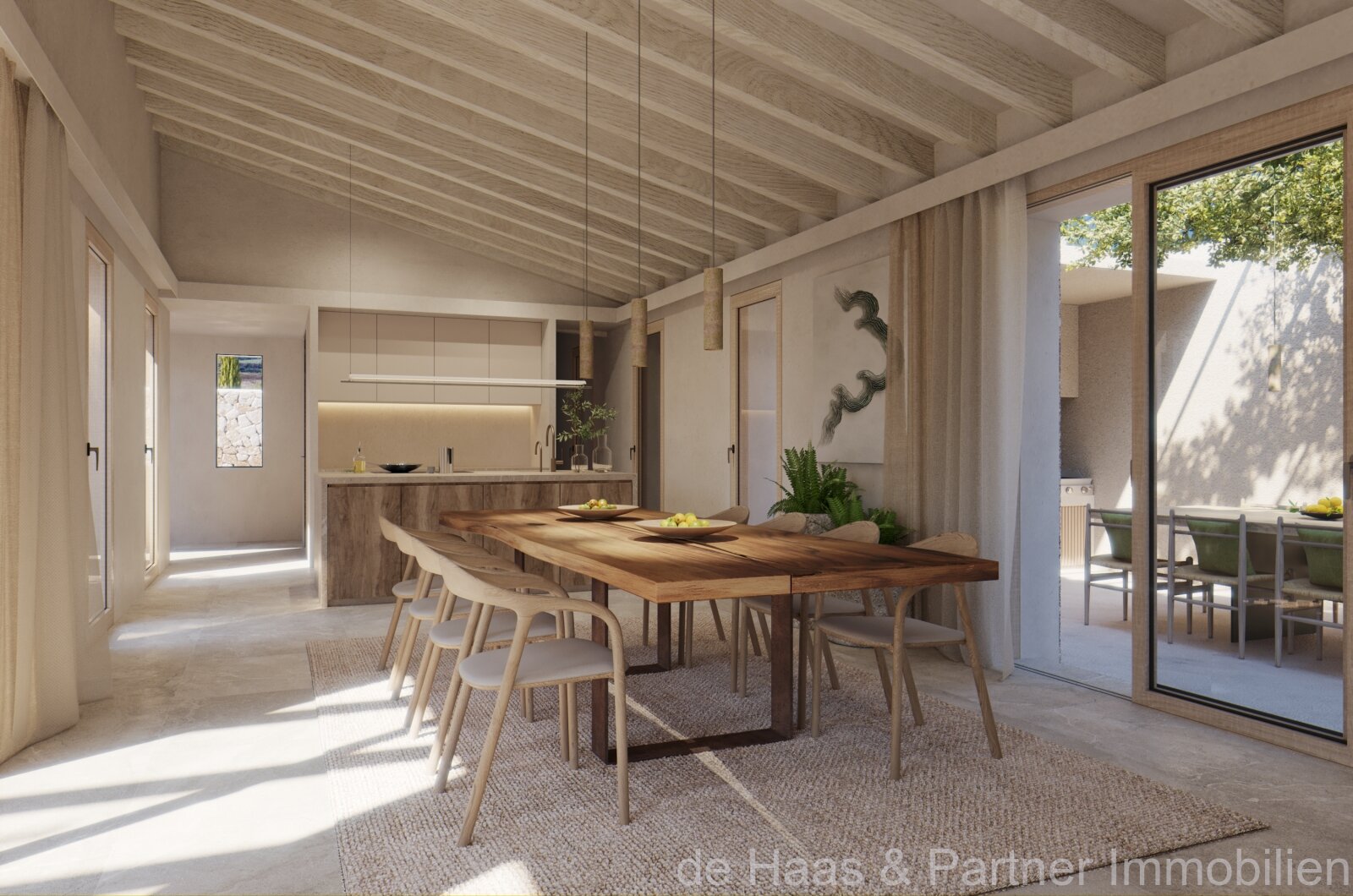 Many Mallorcan elements such as natural stone walls and exposed ceiling beams were incorporated into the construction of the finca.