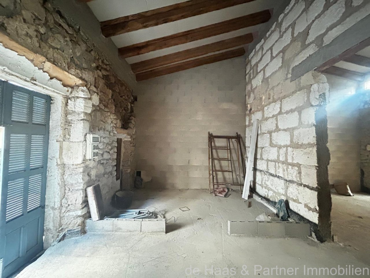 It has high ceilings, a natural stone facade and antique wooden beams.