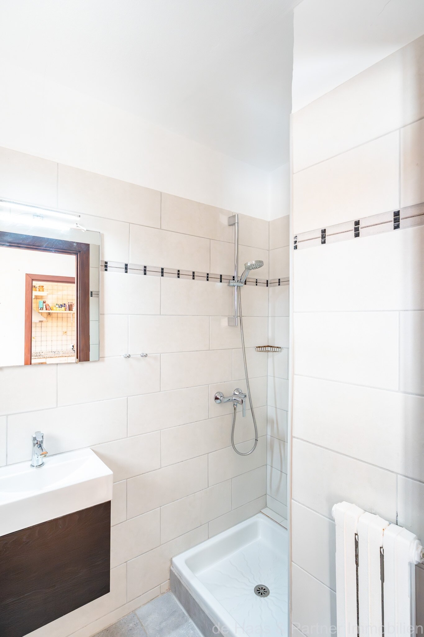 The separate, fully equipped kitchen and a brightly designed shower room are located in the entrance area of the flat.