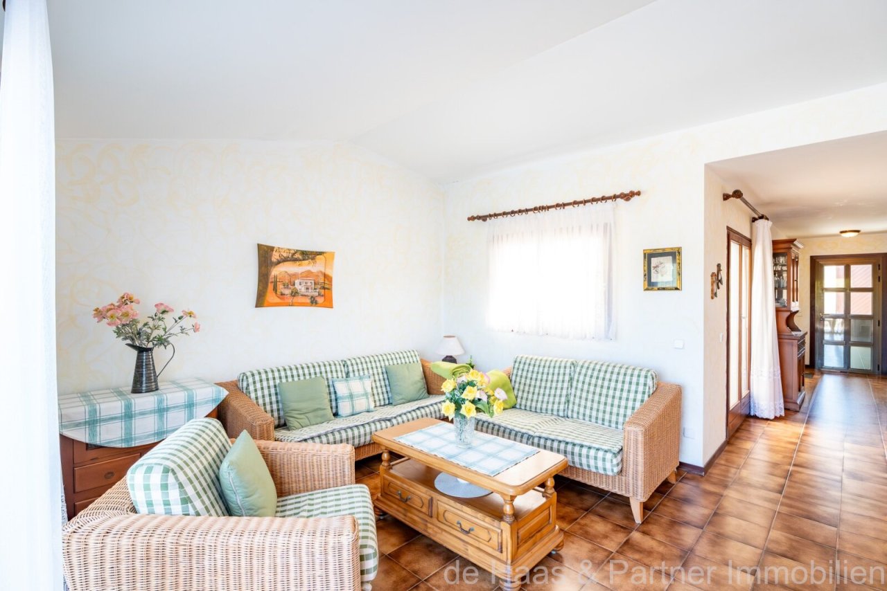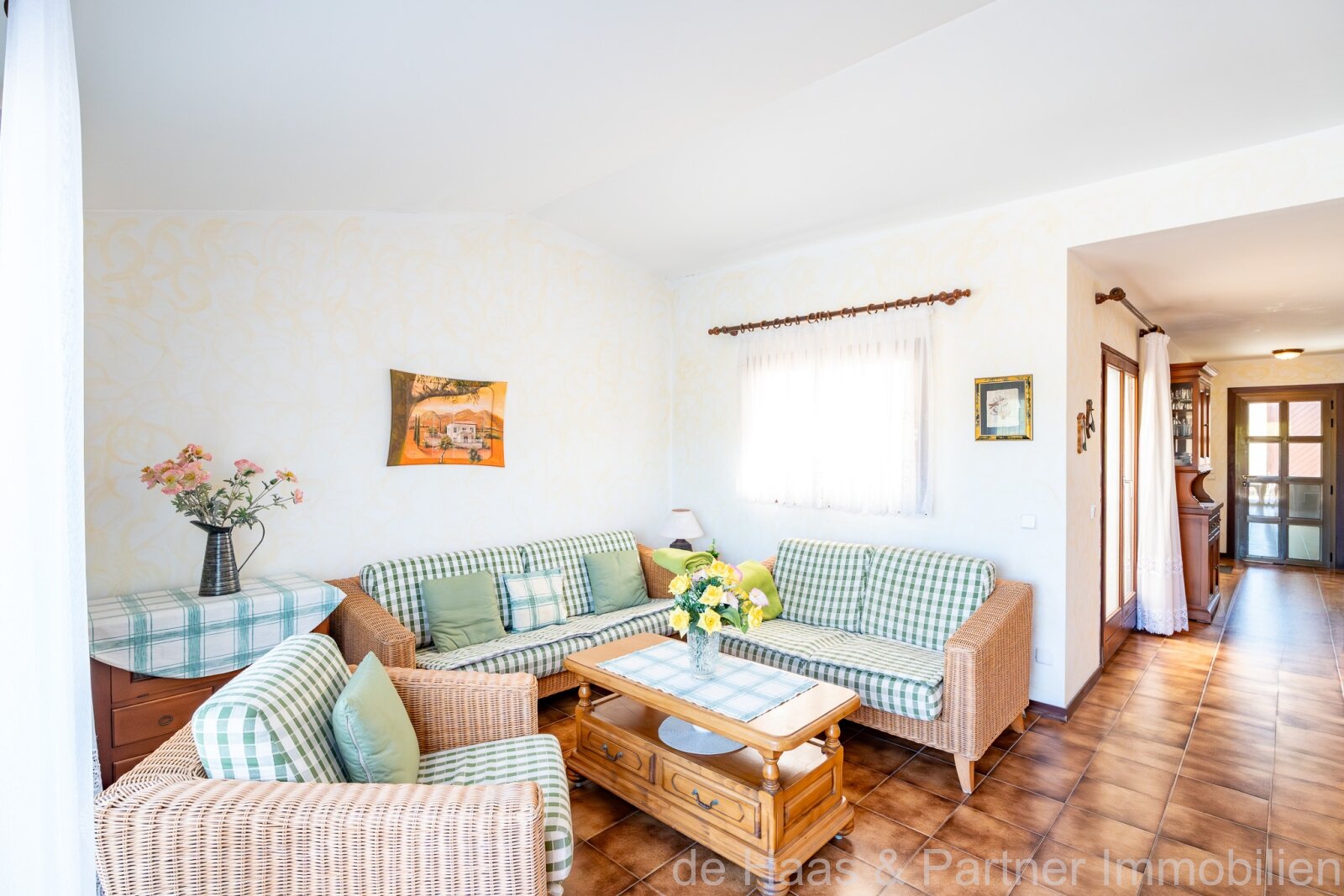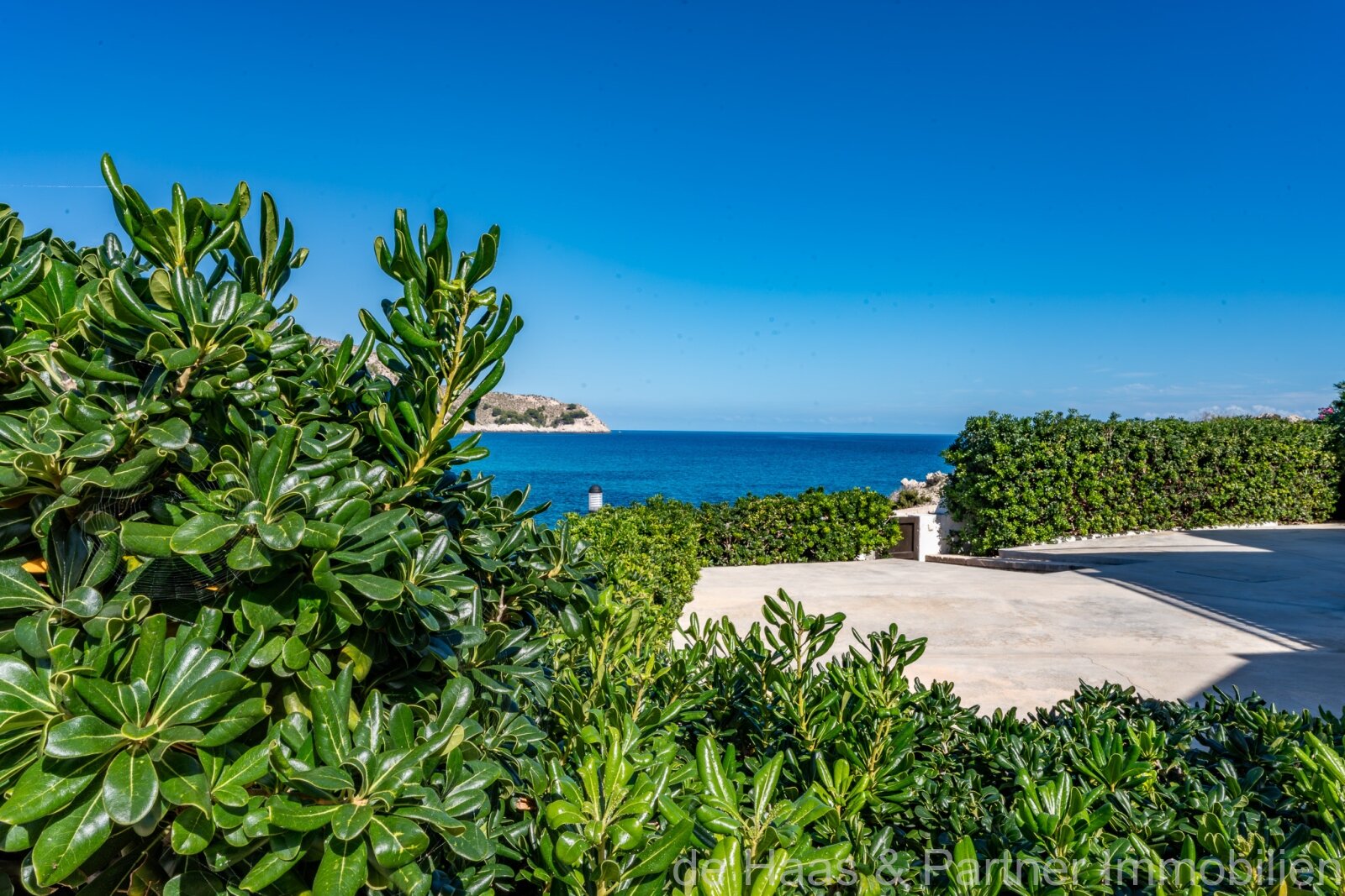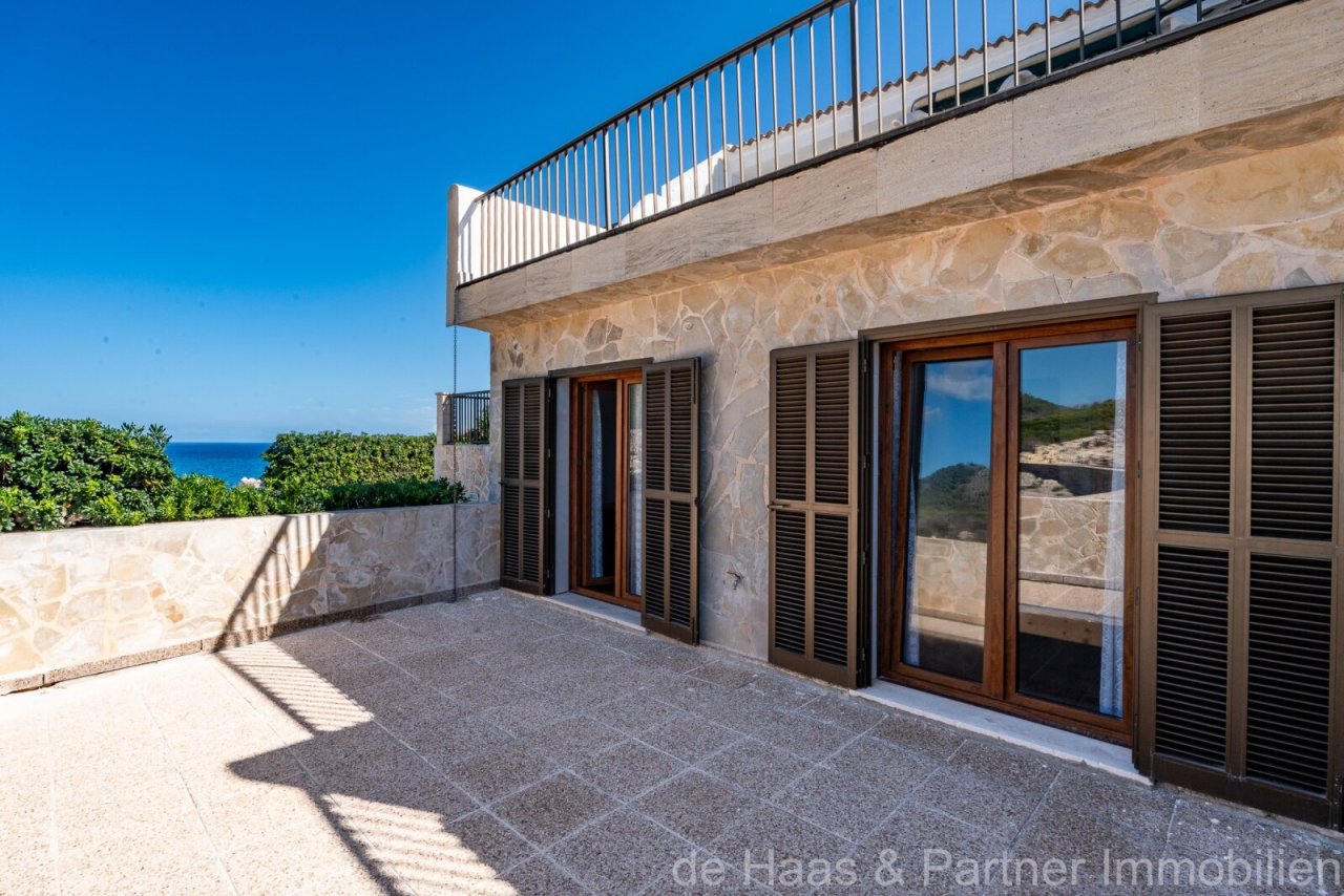 Open-plan living area with cosy sofa corner, dining area and access from the living room to one of the three terraces. From here you can enjoy a magnificent sea view over Cala Agulla and the surrounding mountains.