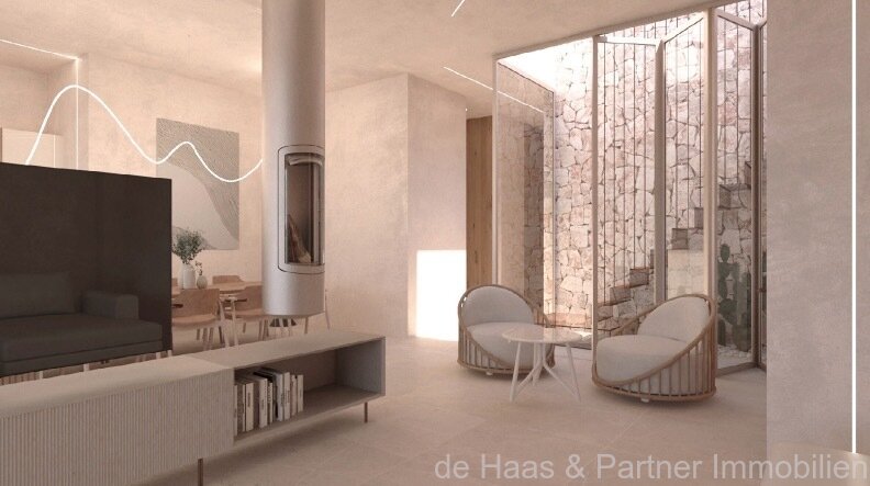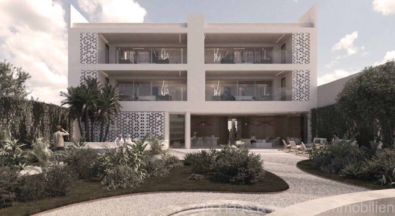 The new construction project is located on the outskirts of Artà, yet within walking distance of all the village's shops and restaurants. The 1,250 m² plot has a project for the construction of 2 duplex penthouses (177 m²) with private roof terrace and pool (approx. 160 m²), as well as 2 apartments on the first floor (177 m² living space) with a terrace (27 m²) and also with high-end fittings. Each flat has 3 bedrooms with 3 en-suite bathrooms, as well as a large living area with floor-to-ceiling windows, a fireplace and an open-plan kitchen. Each flat also has 2 underground parking spaces. A shop is planned for the ground floor. Due to their location on the outskirts of the village, all flats offer beautiful views of the countryside and mountains.