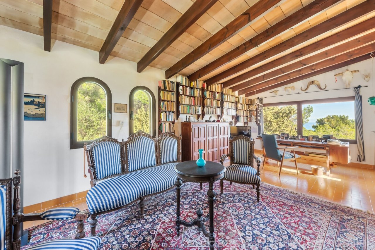 Planta superior: Una escalera abierta de madera conduce a la planta superior, donde hay una gran biblioteca (ideal como dormitorio principal) y otro dormitorio grande con despacho/chimenea contiguo y un cuarto de baño con bañera. Una escalera exterior conduce desde la biblioteca a una terraza con espectaculares vistas al mar.