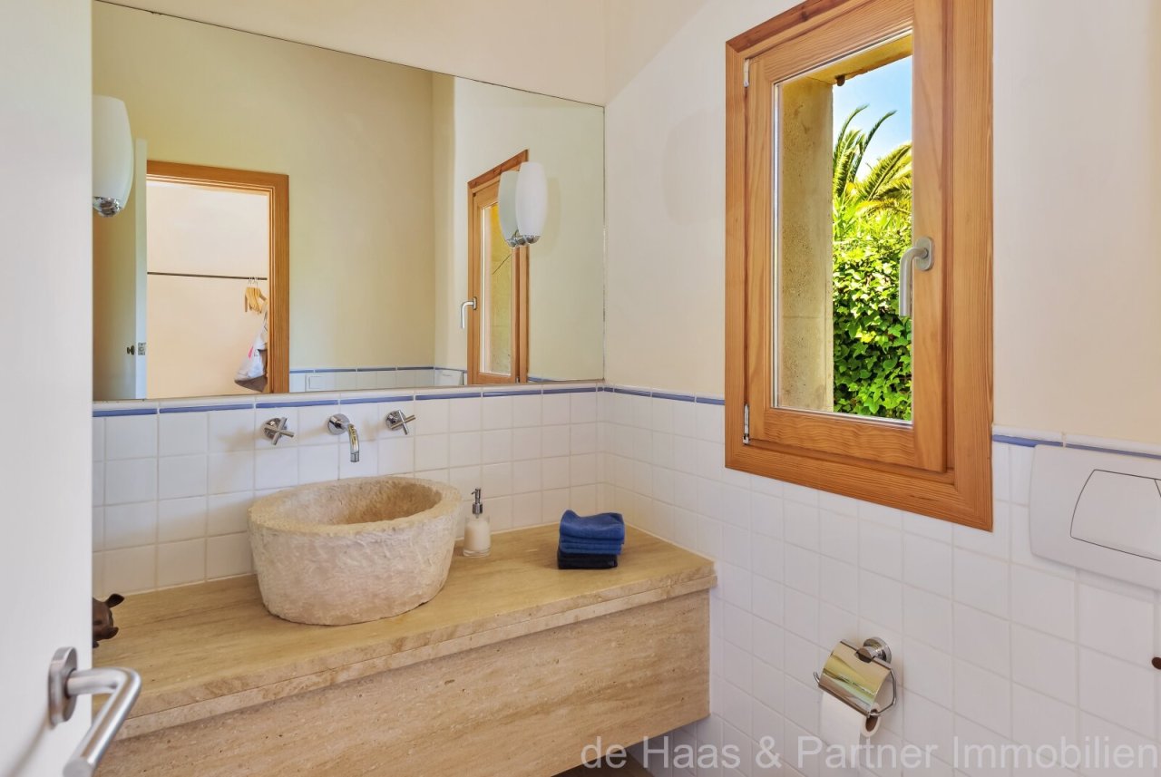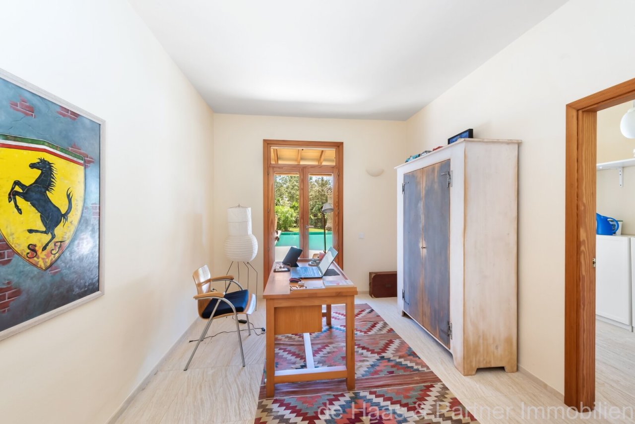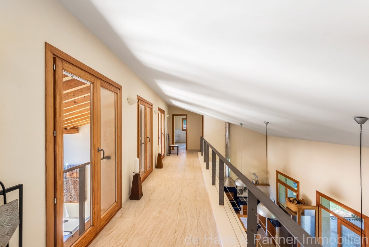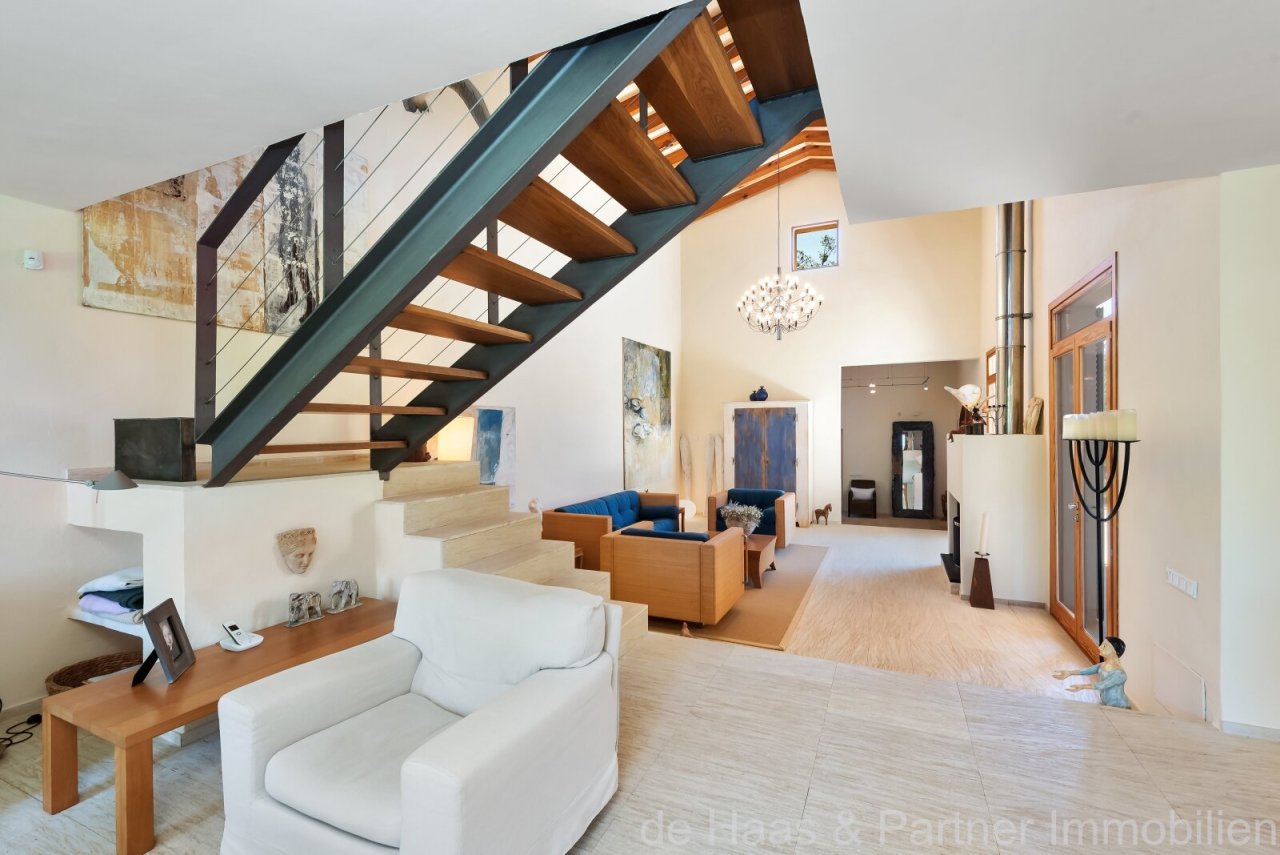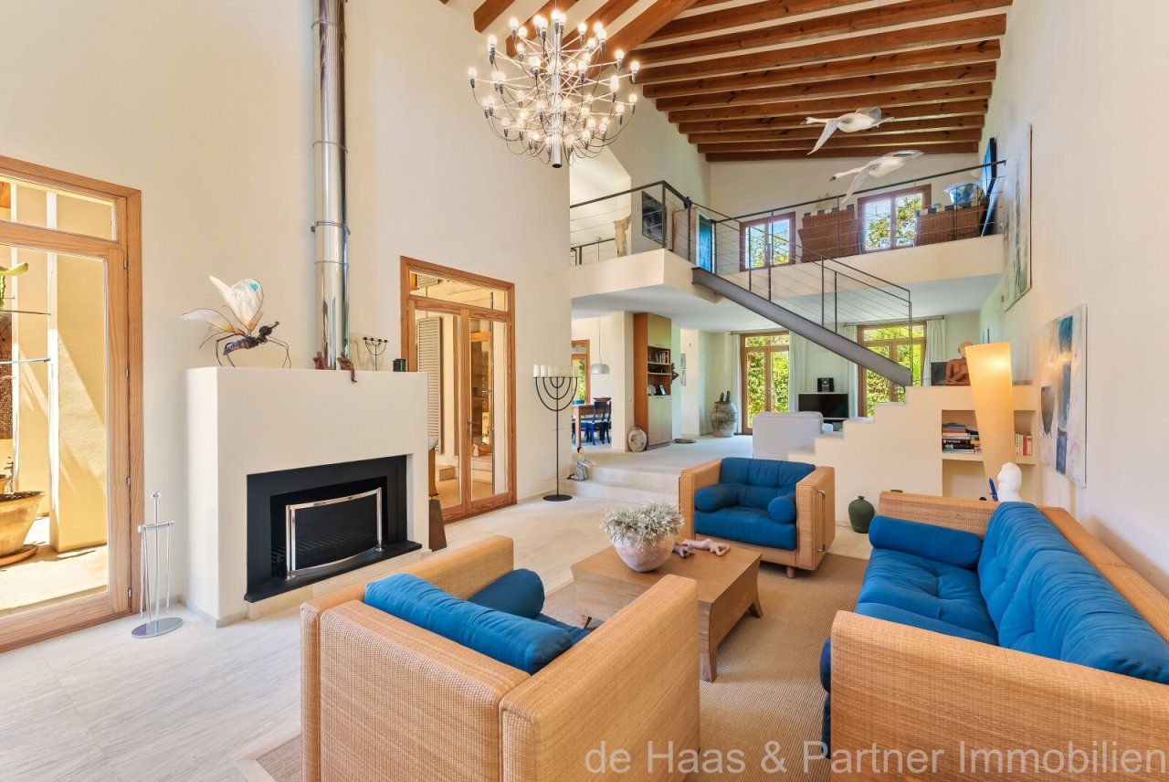 La zona exterior también convence en todos los aspectos: frente a la amplia terraza con tumbonas se encuentra la piscina de 43 m², rodeada de plantas mediterráneas, palmeras, olivos y un césped bien cuidado. Por la noche, una iluminación exterior bien pensada garantiza momentos evocadores.