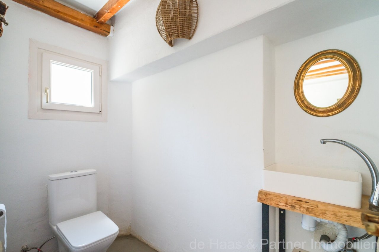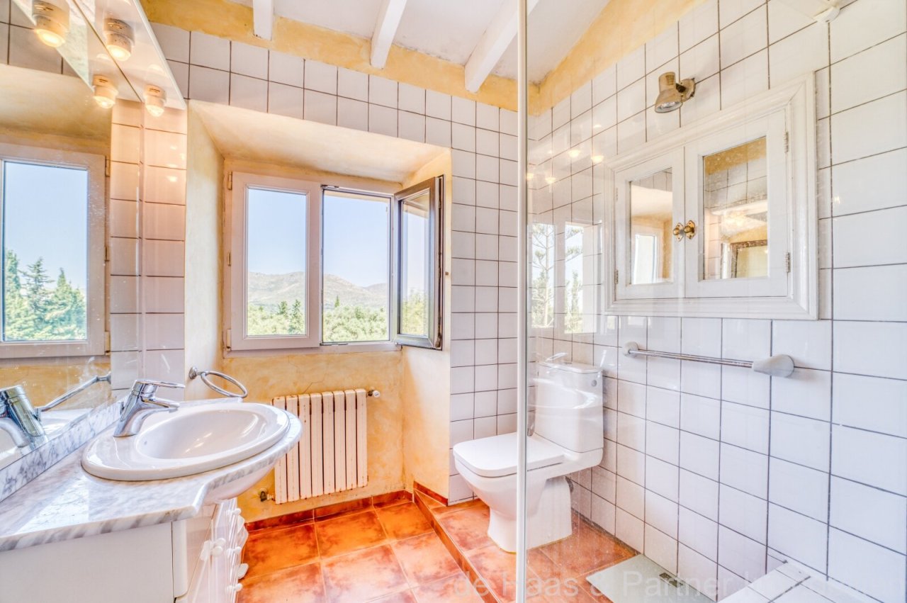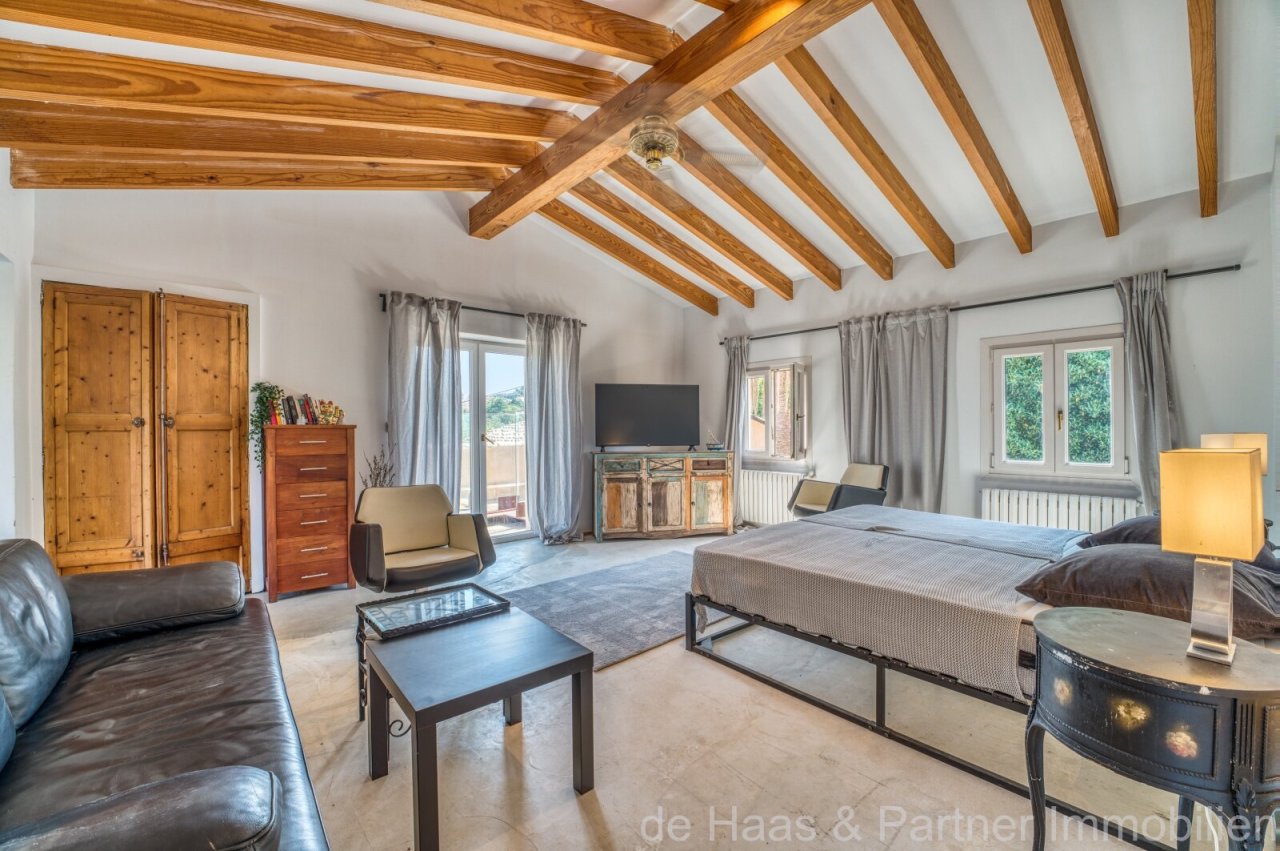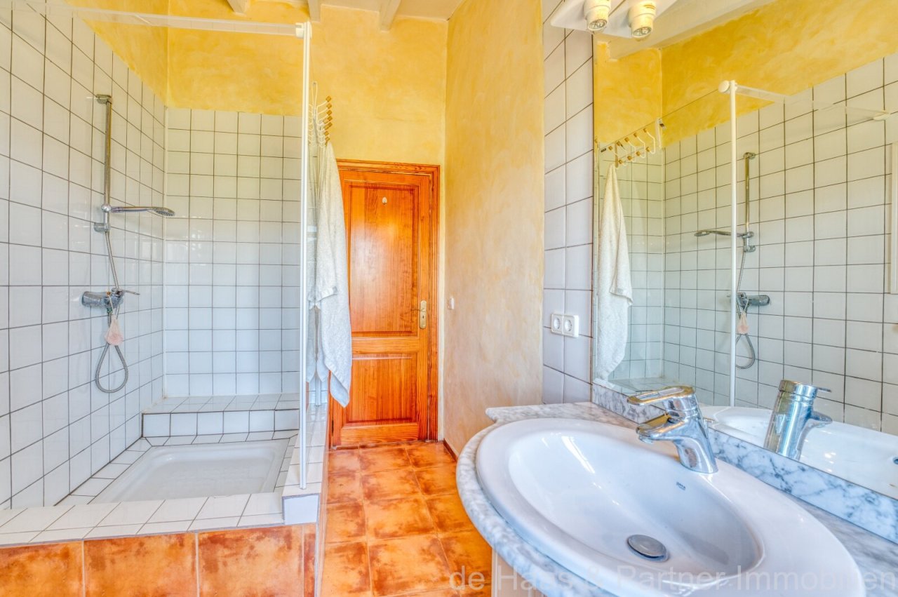 Planta superior: desde un pequeño pasillo central se accede, a la derecha, a dos amplios dormitorios, uno de ellos en pasillo, con un cuarto de baño en suite detrás. Ambos dormitorios tienen acceso a una terraza orientada al este (aprox. 25 m²), desde la que también se puede acceder a la terraza de la piscina a través de una escalera y a la entrada de la finca a través de otra escalera. A la izquierda hay un tercer dormitorio con acceso a una gran terraza, parcialmente cubierta, y un cuarto de baño con ducha independiente.