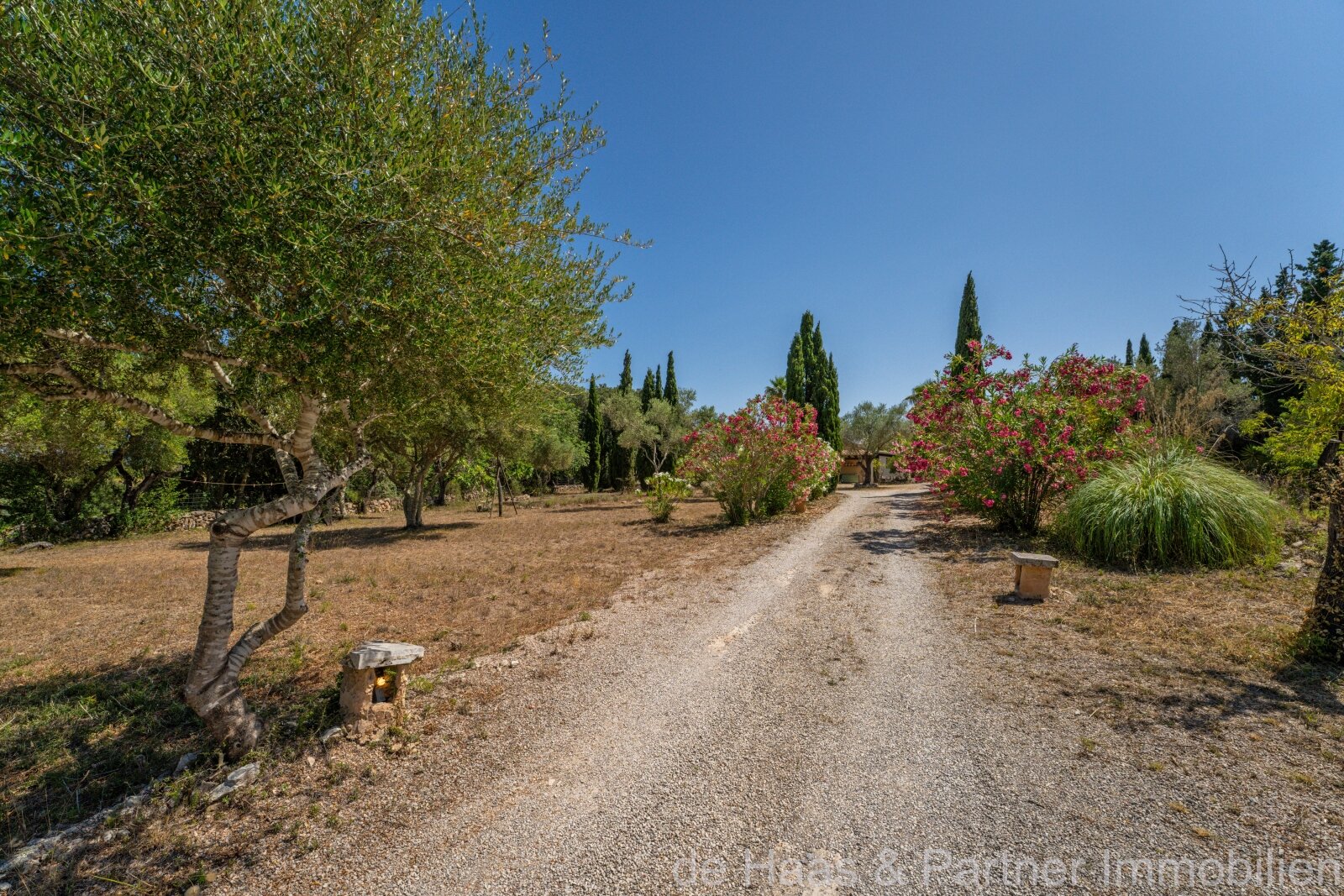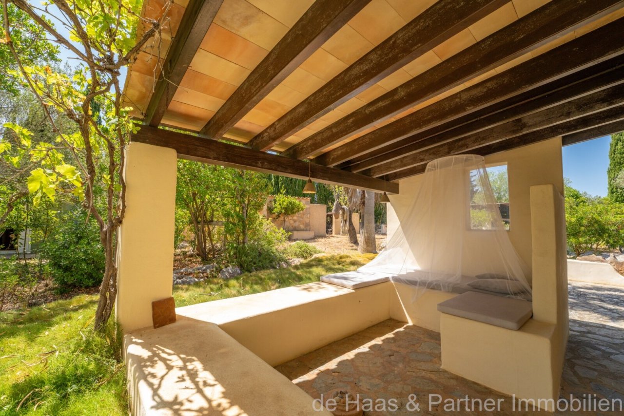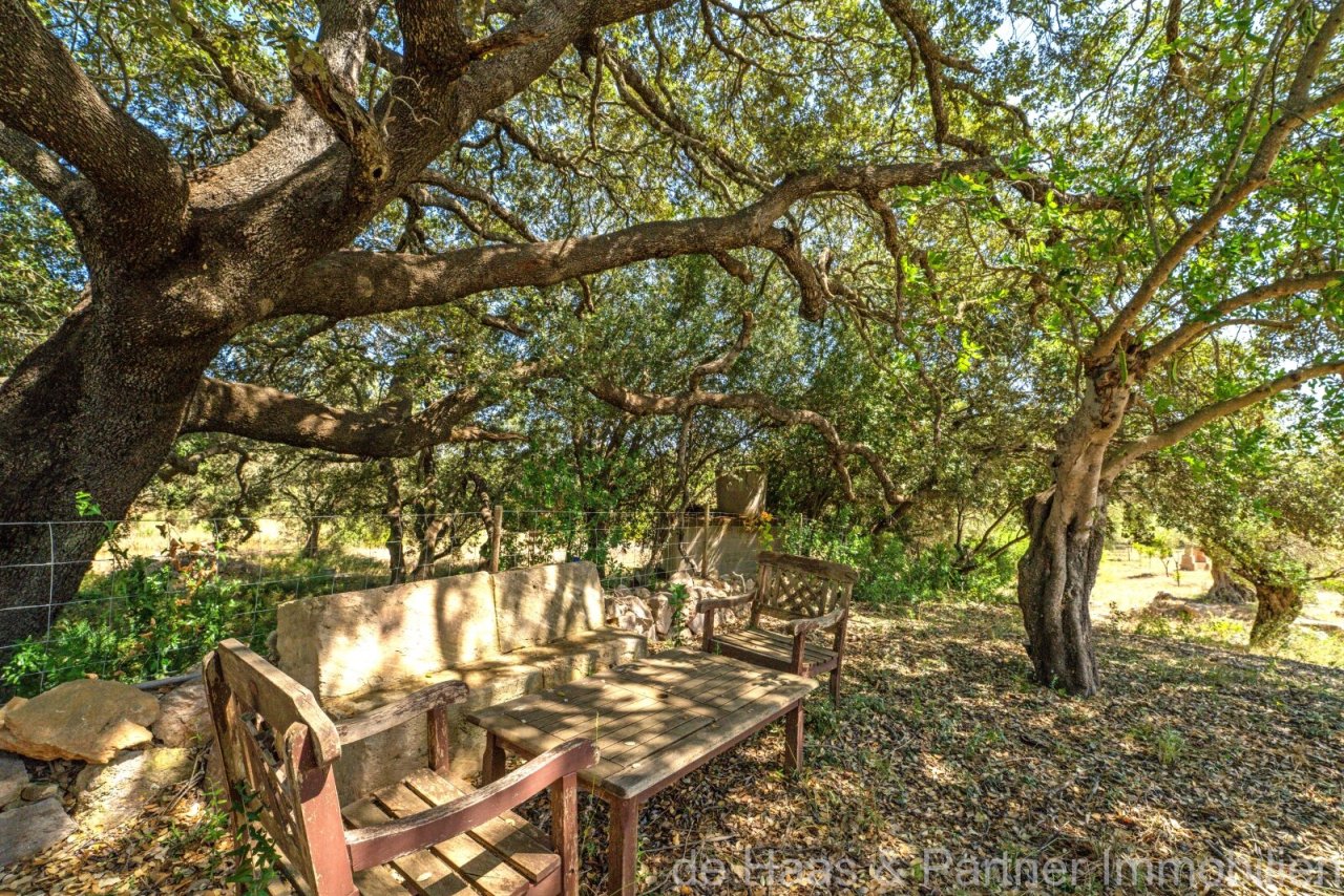 La parcela (aprox. 5.502 m²) y el jardín están bellamente diseñados al estilo mediterráneo con palmeras, olivos centenarios, encinas, árboles frutales, adelfas y muchas sorpresas.