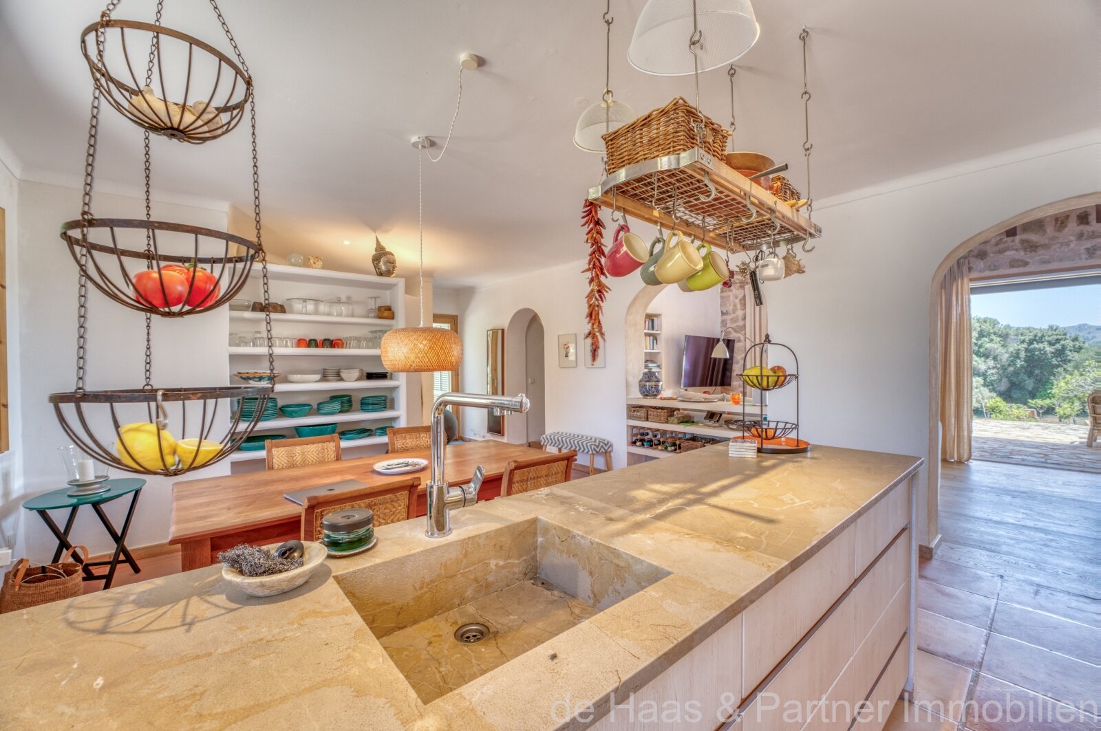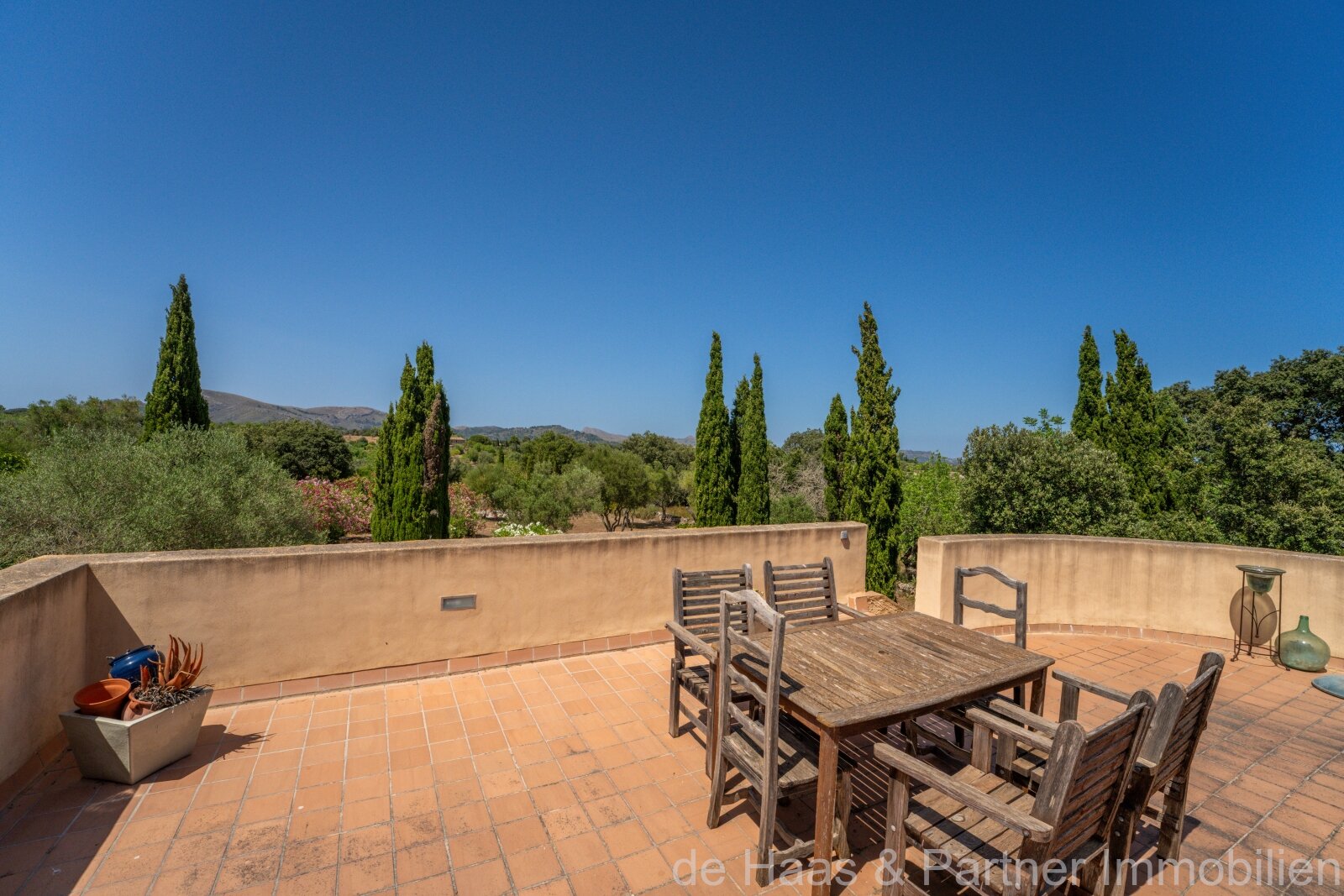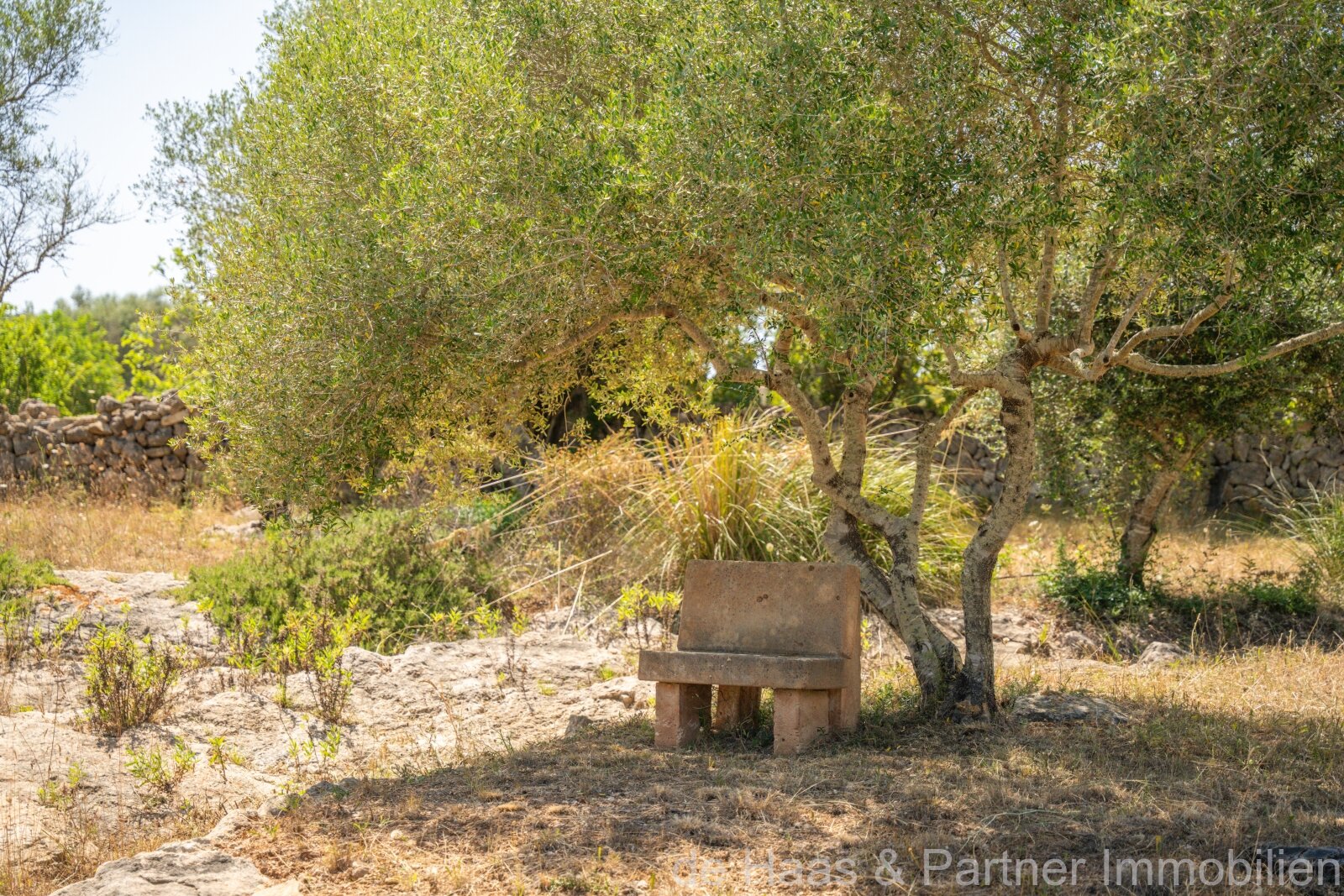 La parcela (aprox. 5.502 m²) y el jardín están bellamente diseñados al estilo mediterráneo con palmeras, olivos centenarios, encinas, árboles frutales, adelfas y muchas sorpresas.