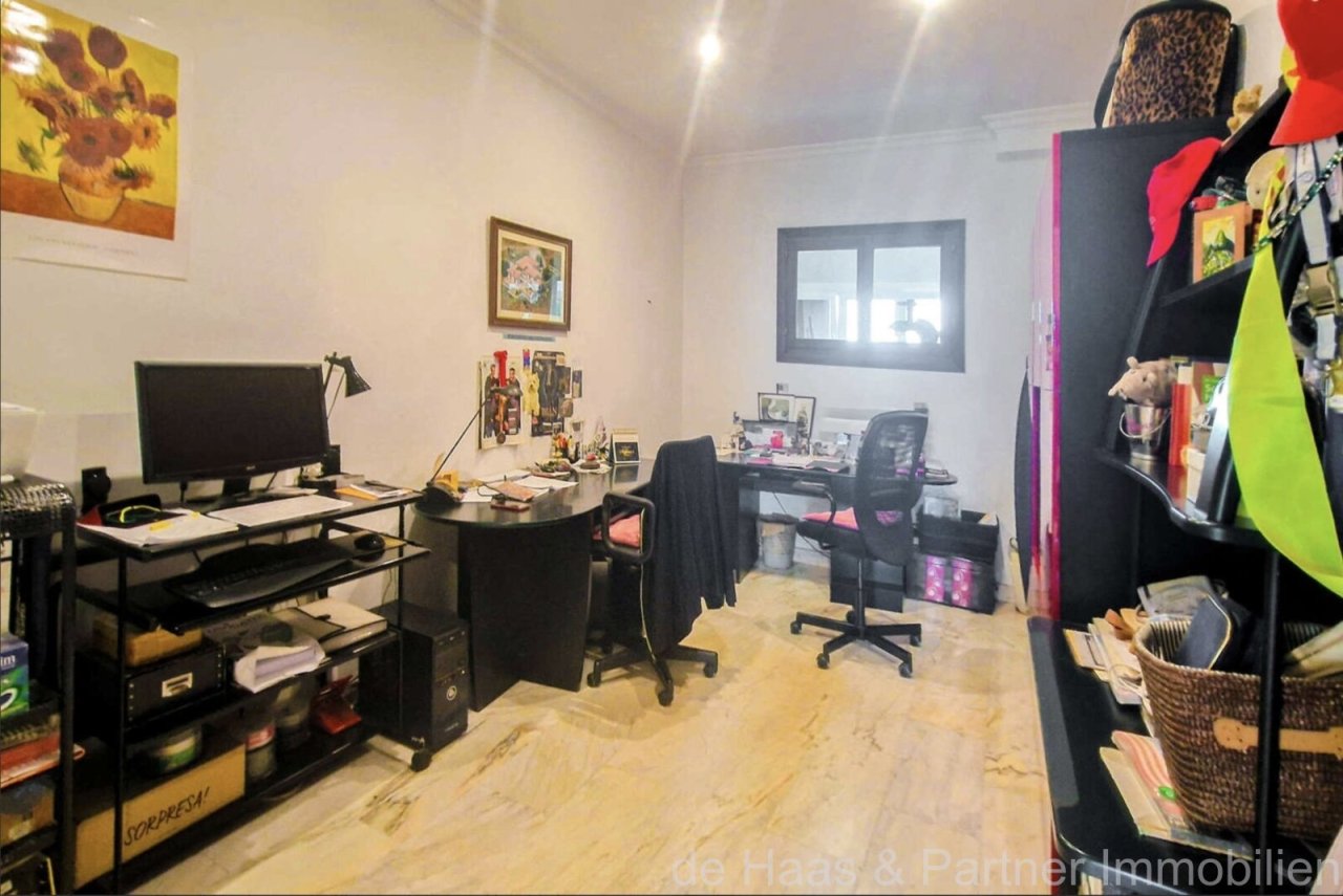 Planta baja: la entrada da a un amplio vestíbulo con la zona de invitados a la derecha, que cuenta con 2 dormitorios y un cuarto de baño independiente (bañera/ducha). También hay un aseo para invitados en el pequeño pasillo. Una oficina, que también se encuentra en esta zona, puede utilizarse sin problemas como dormitorio adicional. Hacia la terraza con piscina hay dos amplios salones con chimenea, uno con comedor y ambos con acceso a la fantástica terraza con piscina. Delante del salón derecho y conectada con él se encuentra la cocina con un pequeño comedor y un lavadero contiguo.