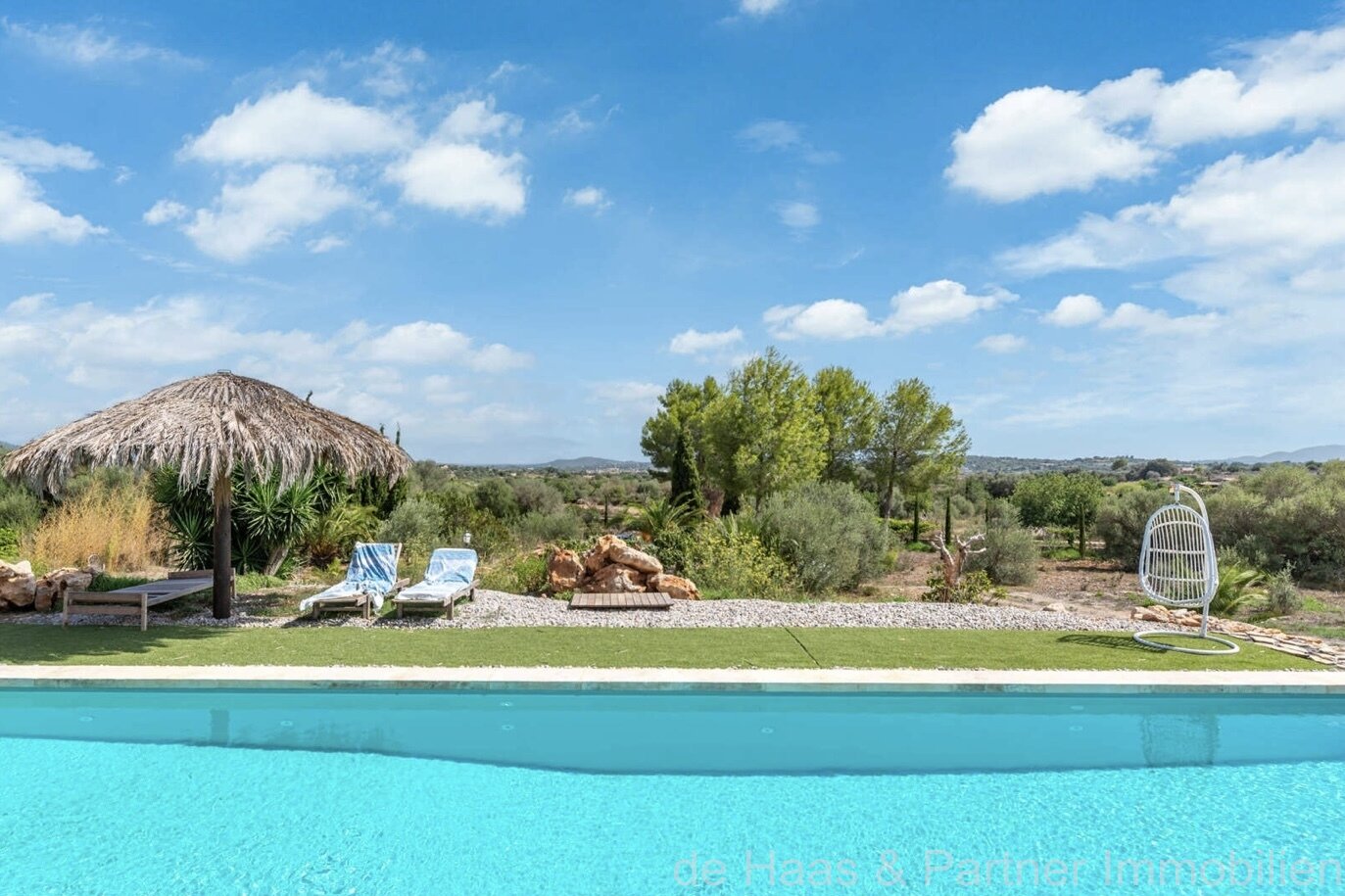 Tanto desde la zona de entrada como desde uno de los dormitorios se accede a la piscina de agua salada de 65 m², rodeada de una enorme terraza con diversas zonas para sentarse y tumbarse. Desde la piscina, las terrazas y la primera planta podrá disfrutar, además de las vistas a las montañas y al paisaje circundante, de las vistas al mar.