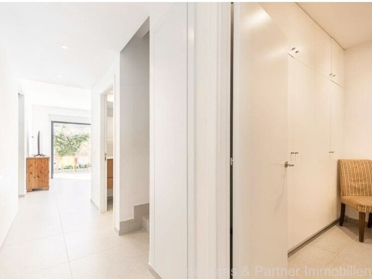 Planta baja: zona de entrada con acceso al garaje y, ligeramente elevada (4 escalones), la sala de estar/sala de televisión con chimenea, así como una gran cocina totalmente equipada con zona de comedor y despensa contigua. Tanto desde la sala de estar como desde la cocina se accede al patio de aproximadamente 70 m², que se puede cubrir parcialmente con un toldo. Un dormitorio y un cuarto de baño con ducha completan la oferta de esta planta.