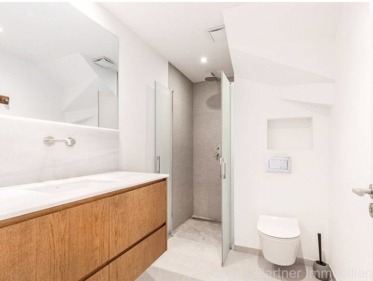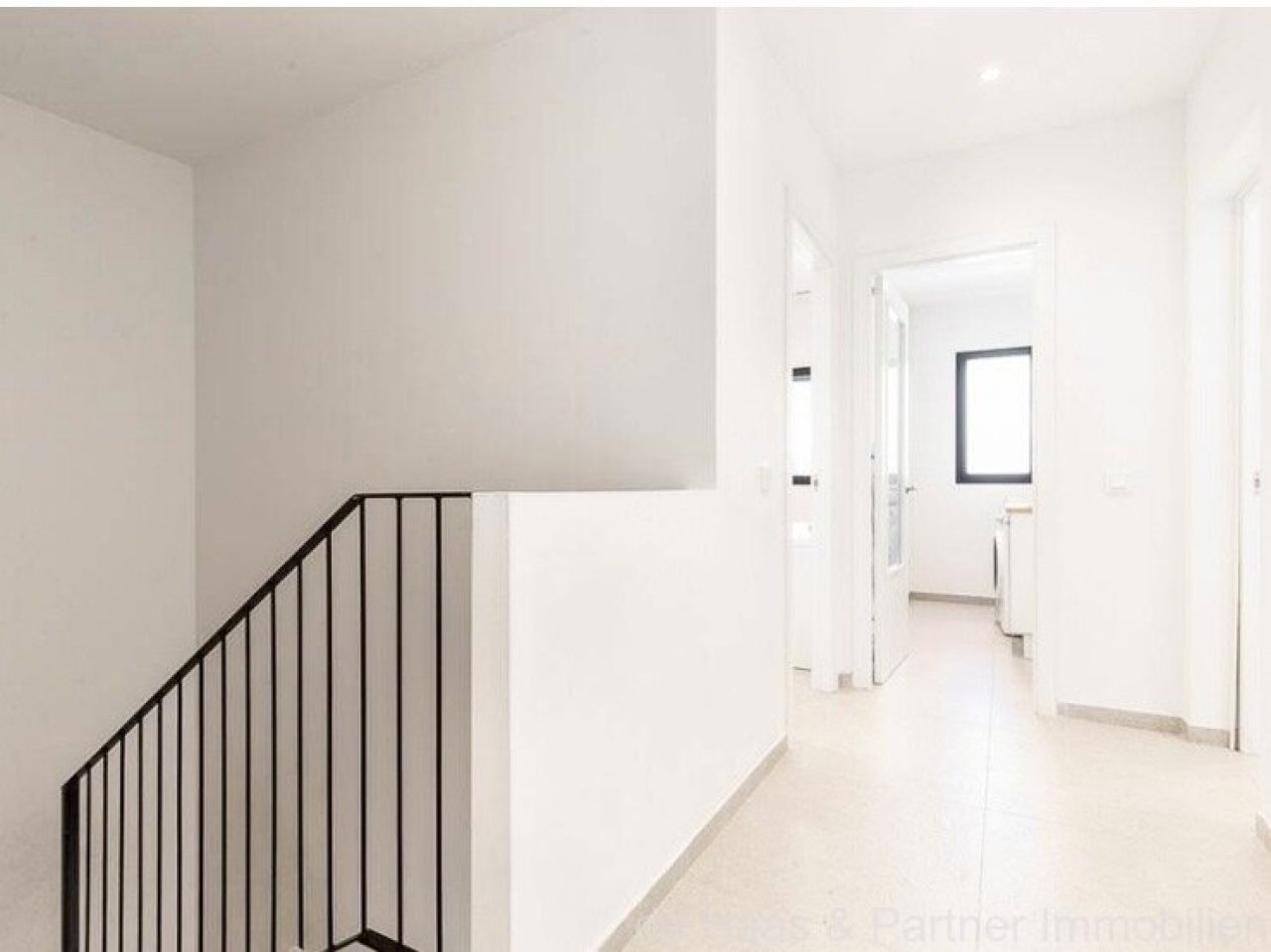 Planta superior: dormitorio principal con un gran vestidor contiguo, así como otros dos dormitorios y un amplio cuarto de baño con ducha. Tanto desde el dormitorio principal como desde el cuarto de baño se accede a la terraza (parcialmente cubierta) de unos 25 m². En esta planta también hay un lavadero.
