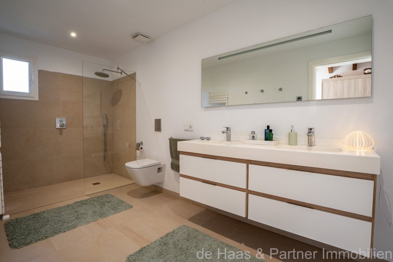 Las grandes puertas correderas permiten que la zona se funda casi sin fisuras con el exterior, en una terraza de 70 m², parcialmente cubierta, con zona de descanso y cocina de verano. Junto al salón hay 4 de las 5 habitaciones. Todas las habitaciones tienen baño en suite con ventana, y 2 de ellas están conectadas por una puerta. Un baño invita a relajarse con una bañera adicional con vistas panorámicas.