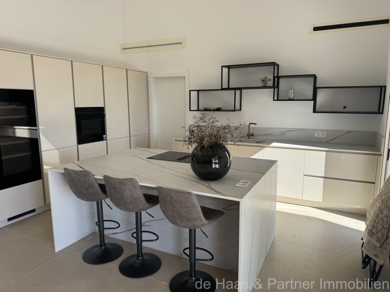 Desde la zona de entrada, a la derecha, se encuentra el amplio y luminoso salón-comedor con una moderna chimenea y acceso a la terraza cubierta, así como a la terraza de la piscina (piscina de 35 m²), que invitan a relajarse, y la altura de la sala con ventanas hasta el suelo crea un concepto luminoso.